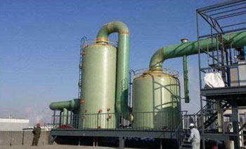 吸收塔是实现吸收操作的设备。按气液相接触形态分为三类。第一类是气体以气泡形态分散在液相中的板式塔、鼓泡吸收塔、搅拌鼓泡吸收塔;第二类是液体以液滴状分散在气相中的喷射器、文氏管、喷雾塔;第三类为液体以膜状运动与气相进行接触的填料吸收塔和降膜吸收塔。塔内气液两相的流动方式可以逆流也可并流。通常采用逆流操作,吸收剂以塔顶加入自上而下流动,与从下向上流动的气体接触,吸收了吸收质的液体从塔底排出,净化后的气体从塔顶排出。